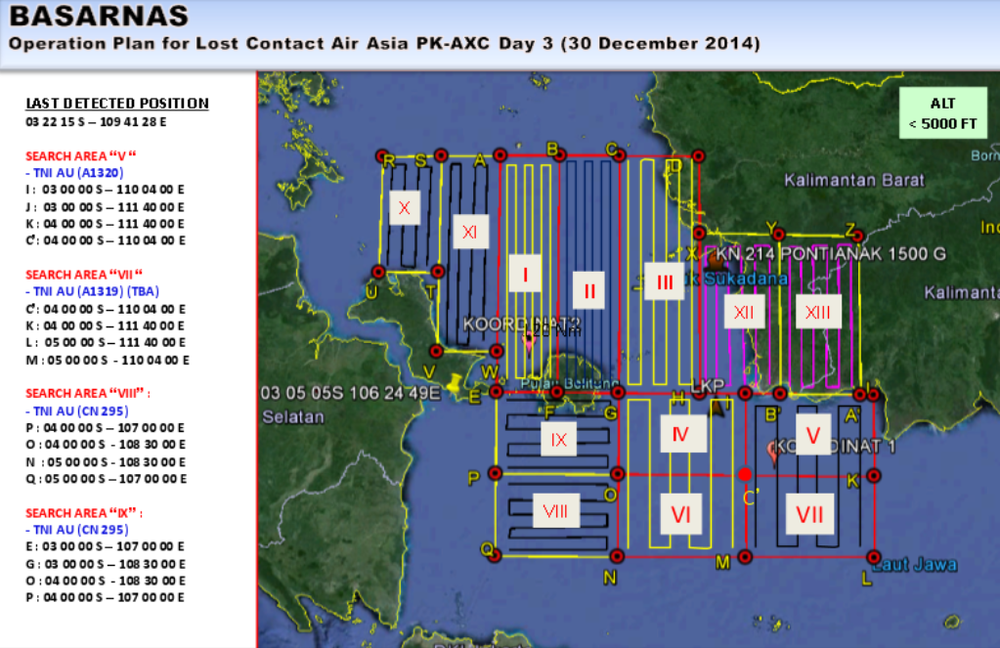Badan SAR Nasional (Basarnas) menyatakan area pencarian hari ini diperluas, dari yang semula hanya 7 area kini menjadi 13 area. Total luas area pencarian mencapai ratusan kilometer persegi.Подробнее о "Basarnas: Total Area Pencarian AirAsia 156 Ribu Km2, Luas Sekali" →