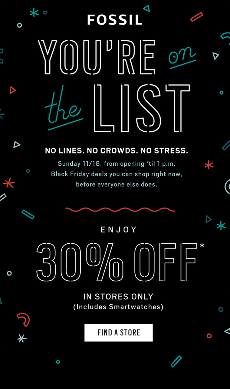 *30% OFF valid on your entire purchase starting 11/18/2018 at 12am CST/1am EST. and ending 11/18/2018 at 1:00 p.m. CT/ 2:00 pm EST . Offer available at all full-price Fossil retail stores located in the U.S. and Canada only. Offer is not valid on Fossil.com, Fossil Outlet stores or through phone purchases. Valid on a single receipt purchase of in-stock merchandise only. Offer not valid on the purchase of Fossil gift cards, Fossil Design A Watch, gift wrap, or Fossil Q sale product. Offer cannot be combined or used in conjunction with any other promotion, discount or coupon code. Offer is non-transferable and valid for one-time use only. Fossil employees are not eligible for this discount. Other exclusions may apply.